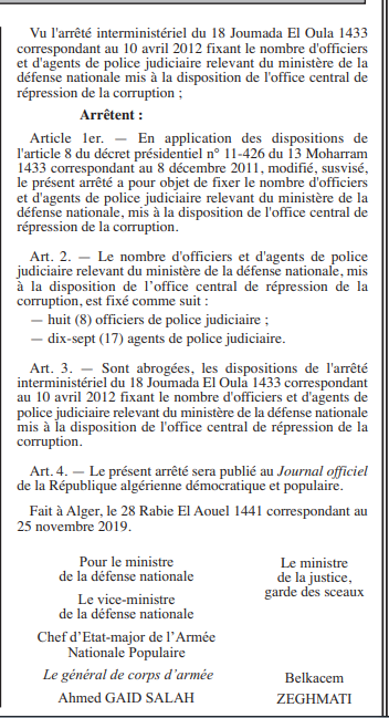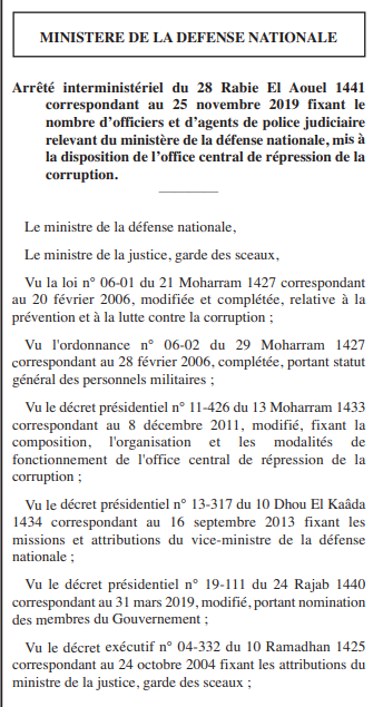 En effet et en application des dispositions de l’article 8 du décret présidentiel n° 11-426 du 13 Moharram 1433 correspondant au 8 décembre 2011, modifié, susvisé, un arrêté ministériel vient de sortir sur le journal officiel a pour objet de fixer le nombre d’officiers et d’agents de police judiciaire relevant du ministère de la défense nationale, mis à la disposition de l’office central de répression de la corruption.