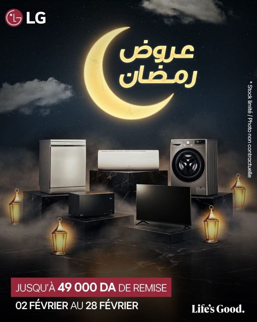 Alger, 2 février 2026 – À l’occasion du mois sacré de Ramadan, LG Electronics Algérie lance une campagne promotionnelle nationale pour accompagner les foyers algériens dans leur quotidien et leur offrir plus de confort, de praticité et de plaisir en famille. Du 02 au 28 février 2026, la marque propose des remises exceptionnelles sur une sélection de produits électroménagers et électroniques premium, allant jusqu’à 49 000 DA.